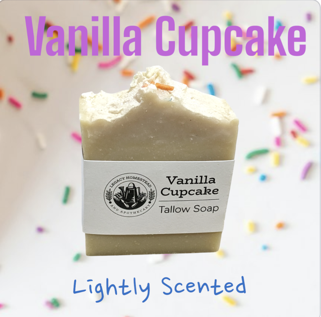 The Vanilla Cupcake Soap contains the Main Base Ingredients, Fragrance Oil and Mica powder.
